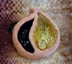 The last piece we made at the weekend was an expression of our hope for the future. I made a shape in clay based on a seedcase I had picked up in Kew Gardens with two halves, one open and gold and one closed in and black, although with a few bits of glitter even there. The ‘seed’, made with a shell, combined both colours, dark and light. I placed it on a piece of printed velvet and wrapped the whole thing in card and tissue paper, black and dull on the outside, gold and shiny within, all tied together with a multicoloured thread.