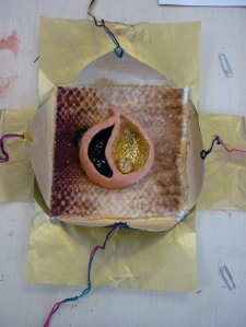 The last piece we made at the weekend was an expression of our hope for the future. I made a shape in clay based on a seedcase I had picked up in Kew Gardens with two halves, one open and gold and one closed in and black, although with a few bits of glitter even there. The ‘seed’, made with a shell, combined both colours, dark and light. I placed it on a piece of printed velvet and wrapped the whole thing in card and tissue paper, black and dull on the outside, gold and shiny within, all tied together with a multicoloured thread.